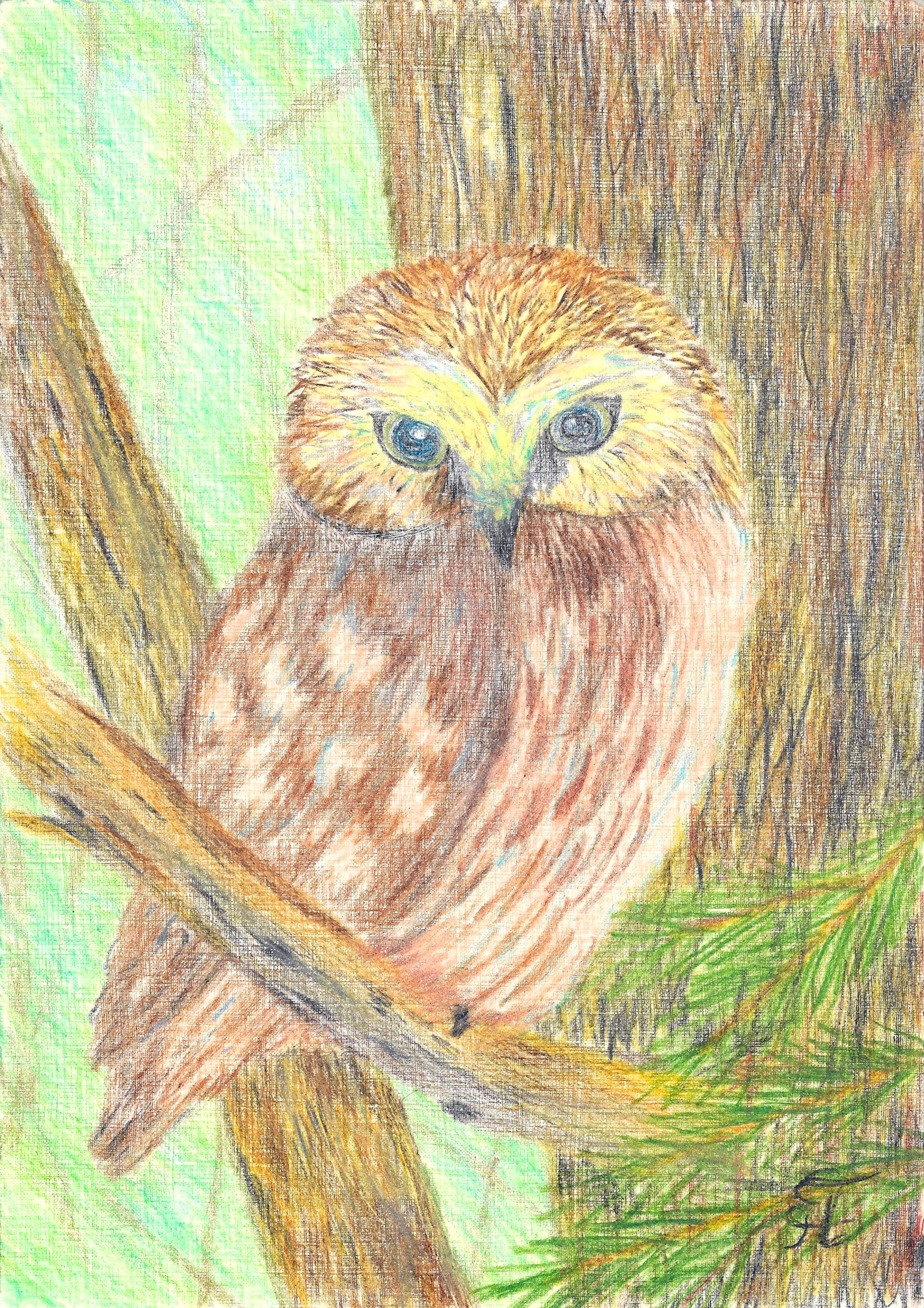 Совушка. Нарисована профессиональными цветными карандашами. Левой ногой