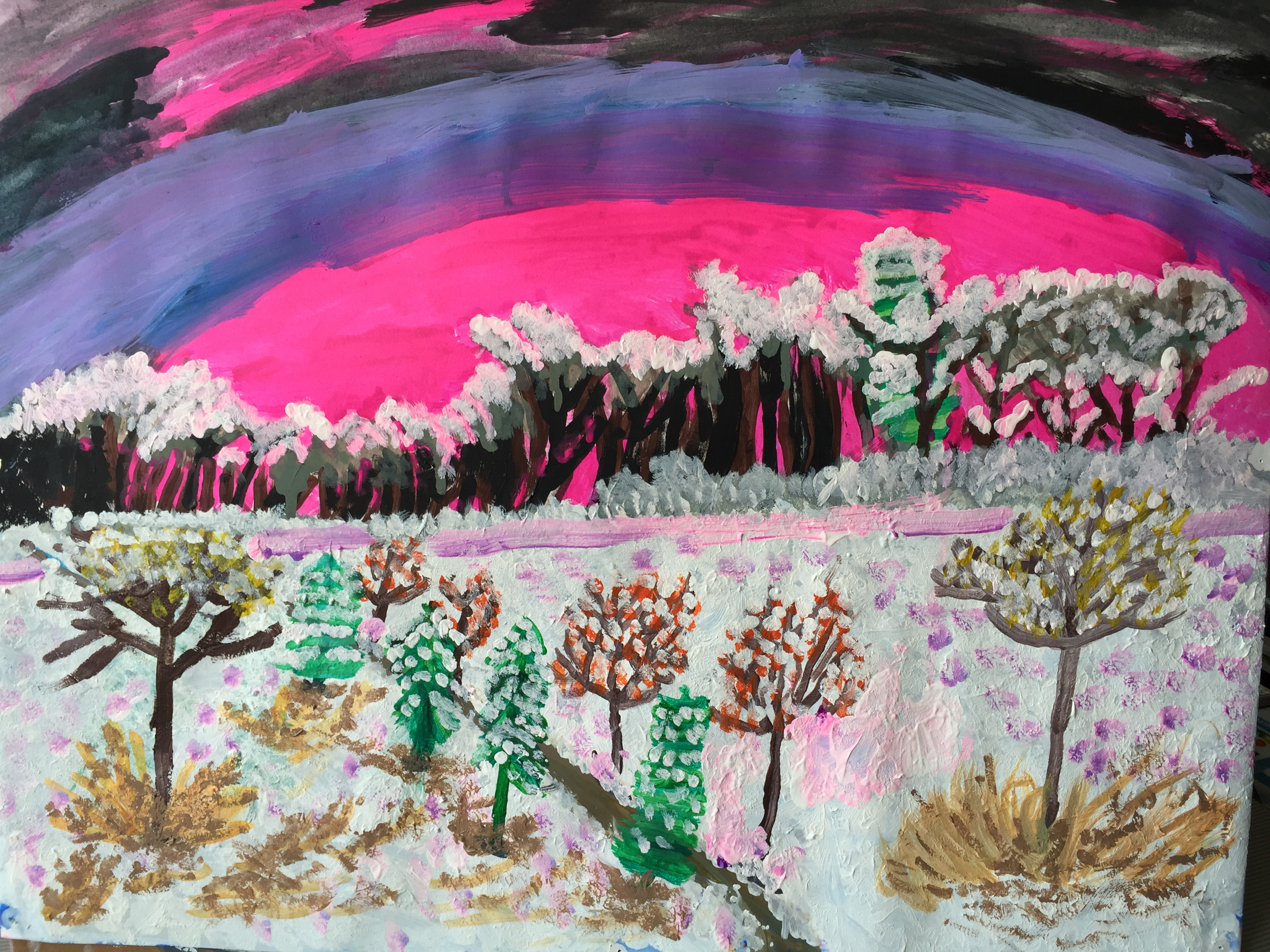 Картина выполнена инвалидом 1 группы, ДЦП. При помощи кисточки, прикреплённой к голове. На ватмане, акриловыми красками. Алексей живёт в п. Мирный Самарской области, Увлекается живописью с 14 лет. Очень любит животных ,особенно собак . У него много картин , изображающих природу. Немного фантазии - и вы попадаете в яркий, красочный мир , как на этой картине "Розовый закат"
