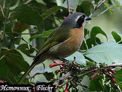 Ошейниковый кустарниковый сорокопут Chlorophoneus kupeensis 15259 Ошейниковый кустарниковый сорокопут (Chlorophoneus kupeensis) занесен в Красную книгу МСОП в статусе "вымирающий вид"