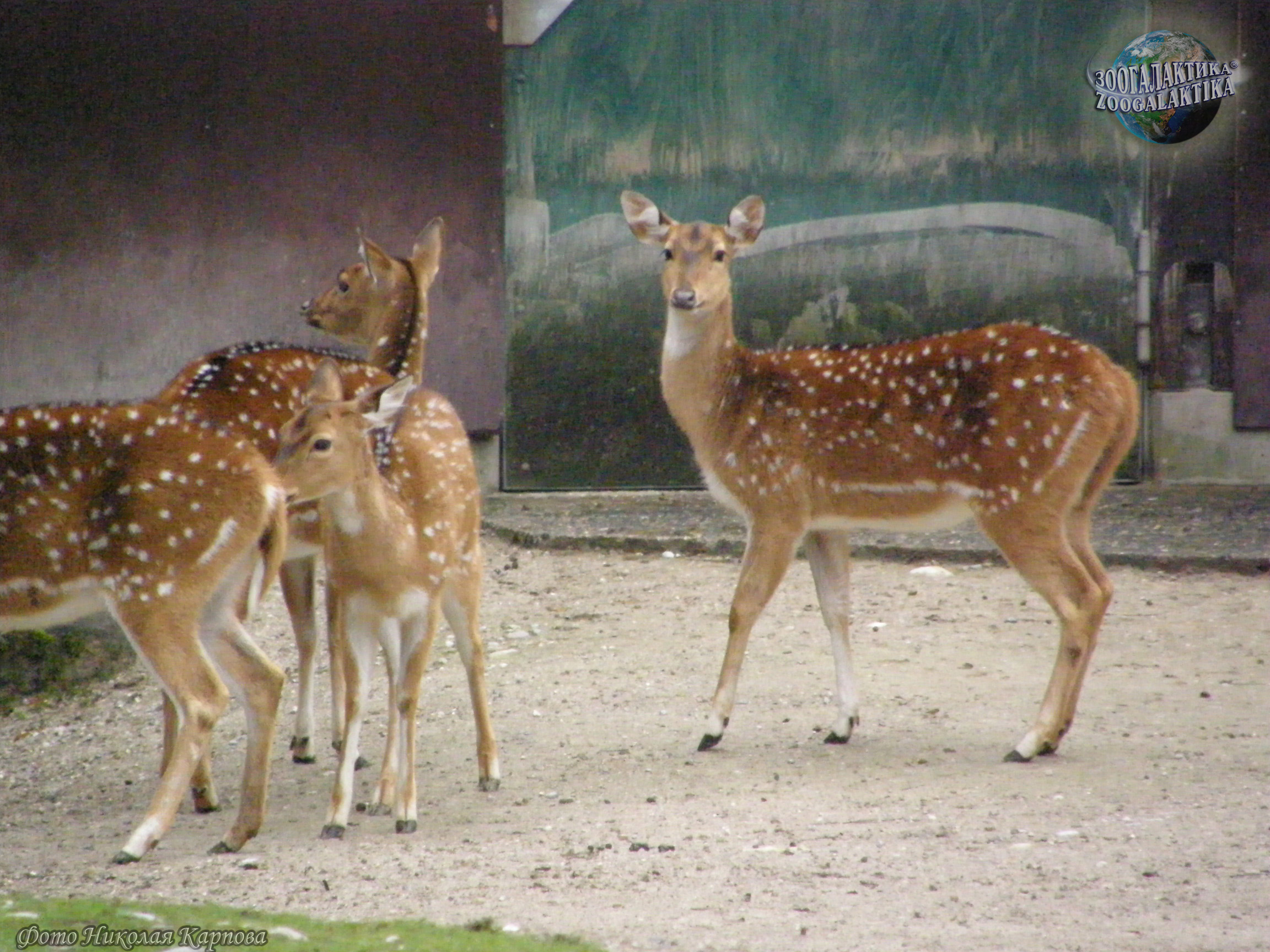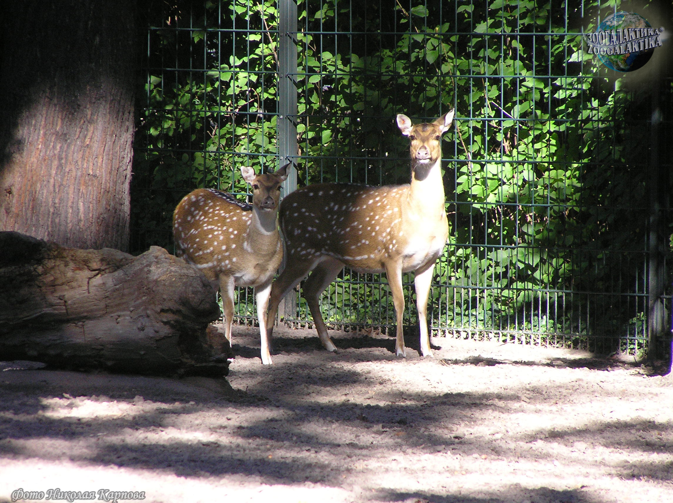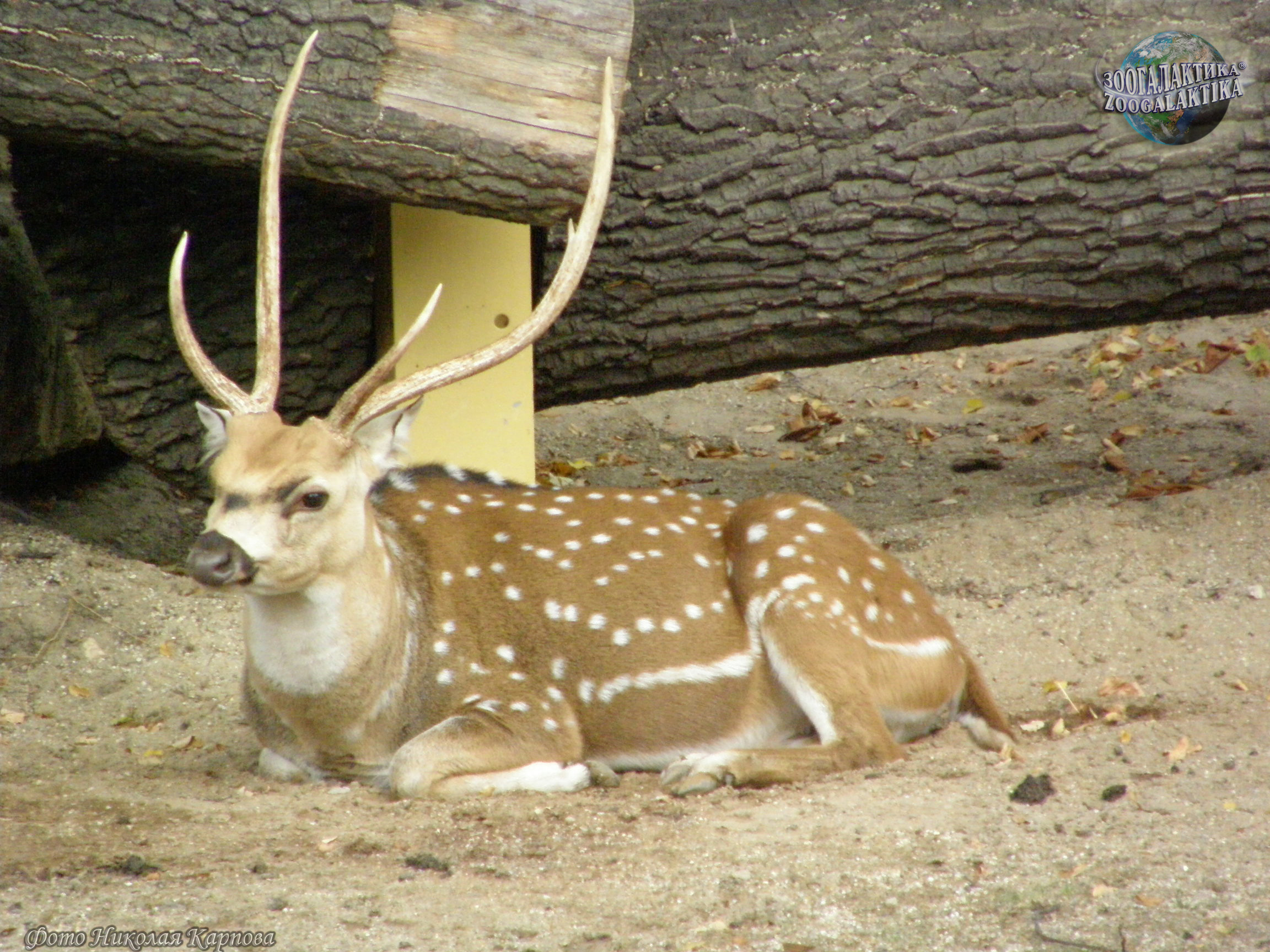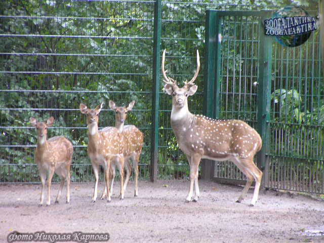 Аксис (Axis axis) - изящный олень с рыжевато-золотистым окрасом шерсти, на котором разбросаны мелкие белые пятна. Длина его тела достигает 150 см, высота – около 100 см, вес до 80 кг. У самцов аксисов ветвистые, с длинными лобными отростками рога.
