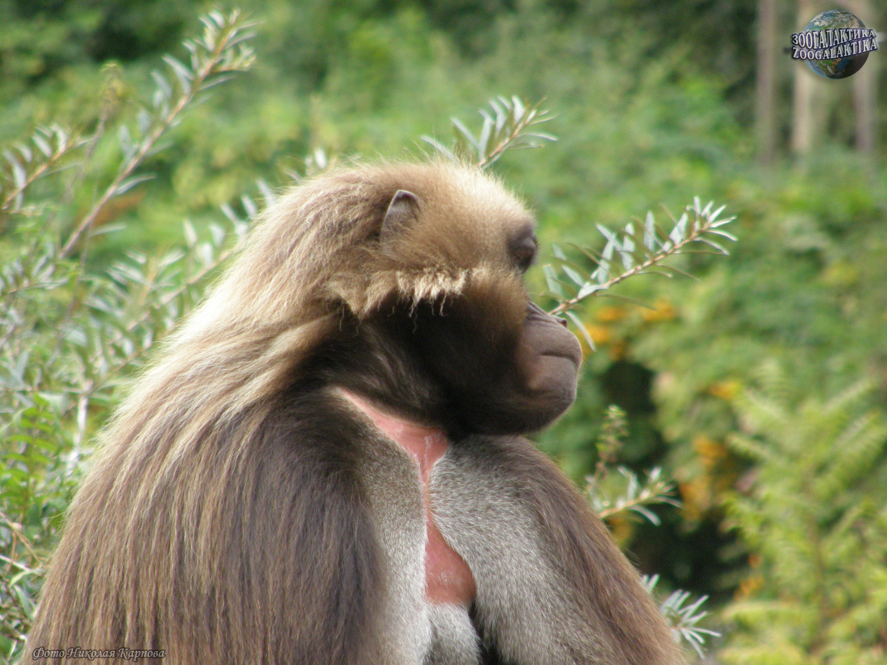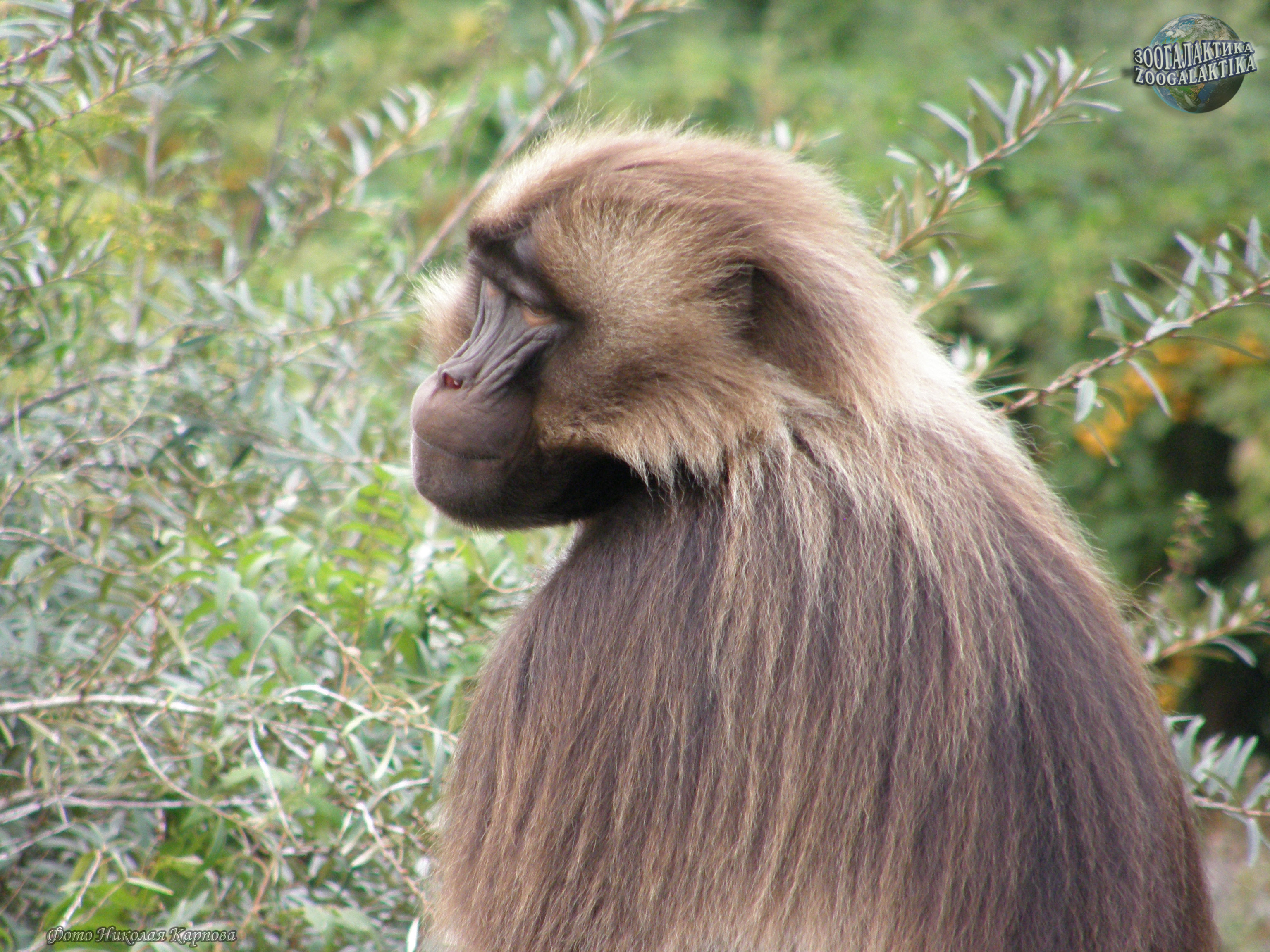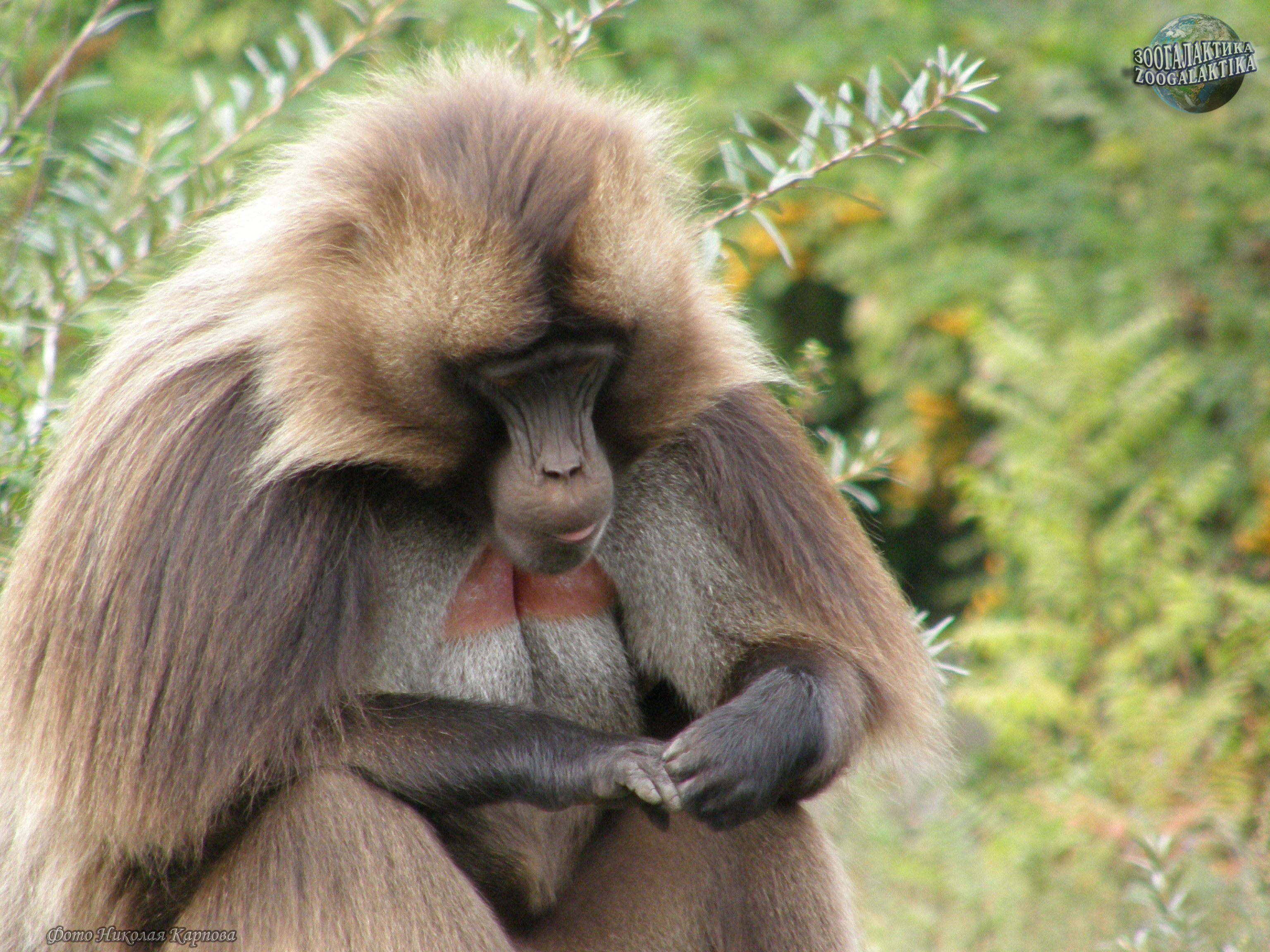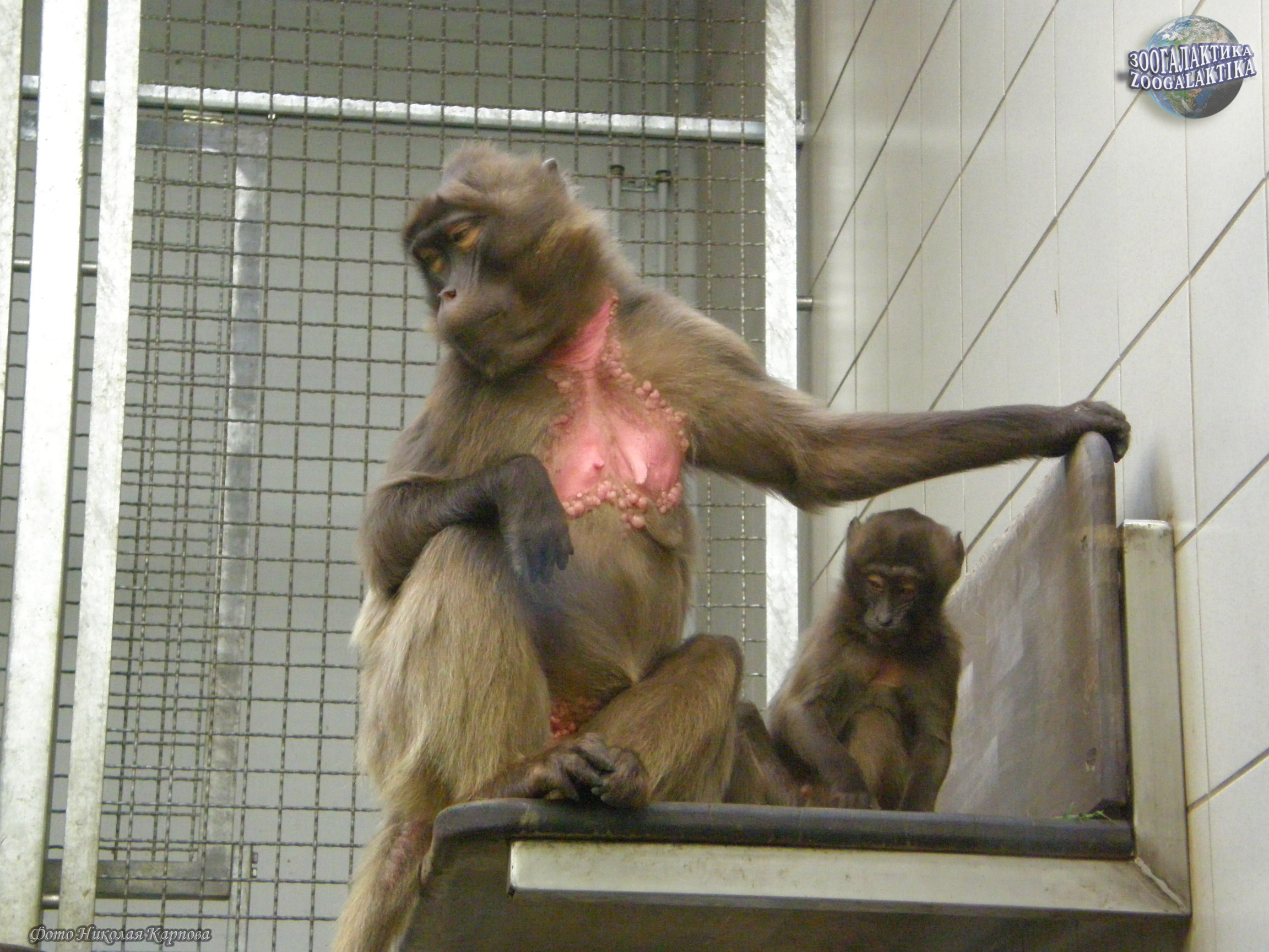 Гелада (Theropithecus gelada) - крупные обезьяны, весом до 25 кг и более; у них непушистый хвост длиной около 50 см и с кисточкой волос на конце; длина тела - 70-75 см. Морда у гелад округлая, в области щек имеются глубокие впадины, а над ними гребни. Шерсть у этих обезьян длинная, шелковистая, буроватая; у самцов имеется мантия из длинных шоколадных волос, покрывающих переднюю часть тела. Самки значительно мельче самцов, и мантия у них отсутствует. Интересной особенностью гелад являются бледные голые участки кожи на шее и груди. У самок эти голые участки окружены мясистыми наростами в виде ожерелья. При возбуждении и в период половых циклов наросты переполняются кровью и становятся багровыми. Кроме того, на груди у самок два соска сидят настолько близко друг к другу, что детеныш захватывает ртом сразу оба соска и сосет молоко из обоих. Седалищные мозоли гелад небольшие и слабо окрашены; кисти у этих обезьян небольшие, пальцы короткие, особенно второй и первый, в связи с чем их способность к схватыванию ослаблена.